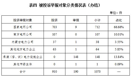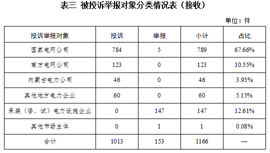從被投訴舉報對象看,供電企業921件、占投訴舉報總數的86.07%,其中國家電網公司712件、占比66.66%,南方電網公司107件、占比10.01%,內蒙古電力公司38件、占比3.55%,其他地方電力企業64件、占比5.85%;承裝(修、試)電力設施企業148件、占比13.84%;其他市場主體1件、占比0.09%。