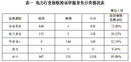 電力行業排在首位,數量為1118件、占投訴舉報總數的95.89%,主要集中在供電服務、市場準入、電力安全等方面。