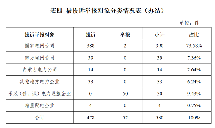 從被投訴舉報對象看,供電企業(yè)476件、占投訴舉報總數(shù)的89.82%,其中國家電網(wǎng)公司390件、占比73.58%;南方電網(wǎng)公司39件、占比7.36%;內(nèi)蒙古電力公司14件、占比2.64%;其他地方電力企業(yè)33件、占比6.24%;承裝(修、試)電力設施企業(yè)50件、占比9.43%;增量配電企業(yè)4件、占比0.75%。