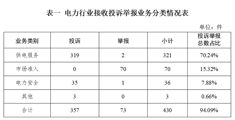 電力行業(yè)排在首位,數(shù)量為430件、占投訴舉報總數(shù)的94.09%,主要集中在供電服務、市場準入、電力安全等方面。