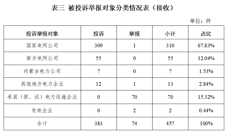 供電企業(yè)385件、占投訴舉報總數(shù)的84.24%,其中國家電網(wǎng)公司310件、占投訴舉報總數(shù)的67.83%,南方電網(wǎng)公司55件、占投訴舉報總數(shù)的12.04%,內(nèi)蒙古電力公司7件、占投訴舉報總數(shù)的1.53%,其他地方電力企業(yè)13件、占投訴舉報總數(shù)的2.84%;承裝(修、試)電力設施企業(yè)70件、占投訴舉報總數(shù)的15.32%;發(fā)電企業(yè)2件、占投訴舉報總數(shù)的0.44%。