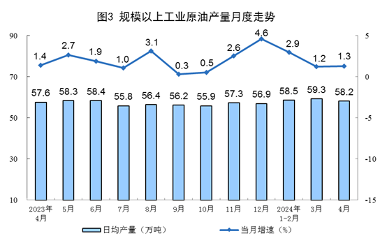 原油生產平穩增長,進口由降轉增。4月份,規上工業原油產量1747萬噸,同比增長1.3%,增速比3月份加快0.1個百分點;日均產量58.2萬噸。進口原油4472萬噸,同比增長5.9%。