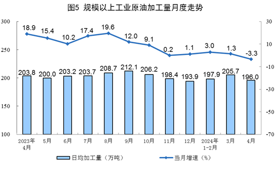 原油加工有所下降。4月份,規上工業原油加工量5879萬噸,同比下降3.3%,3月份為增長1.3%;日均加工196.0萬噸。1—4月份,規上工業原油加工量24126萬噸,同比增長1.1%。