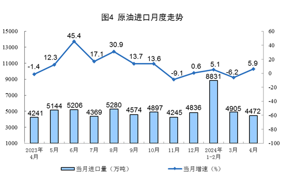 1—4月份,規上工業原油產量7095萬噸,同比增長2.1%。進口原油18207萬噸,同比增長2.0%。