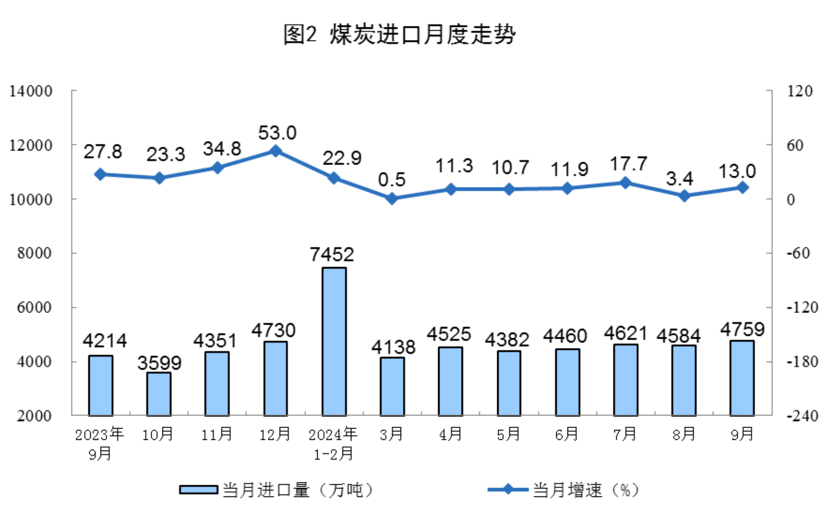 原煤生產增速加快。9月份,規上工業原煤產量4.1億噸,同比增長4.4%,增速比8月份加快1.6個百分點;日均產量1381.5萬噸。進口煤炭4759萬噸,同比增長13.0%。