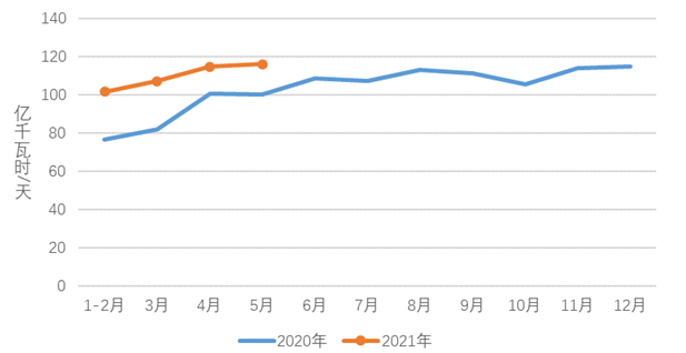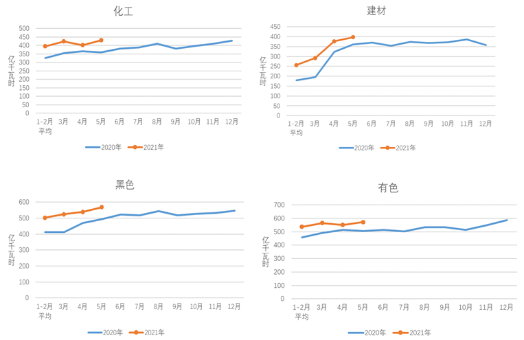 1-5月,化工行業用電量2048億千瓦時,同比增長12.8%,增速比上年同期提高17.0個百分點;建材行業用電量1580億千瓦時,同比增長24.4%,增速比上年同期提高31.8個百分點;黑色金屬冶煉行業用電量2639億千瓦時,同比增長18.3%,增速比上年同期提高19.8個百分點;有色金屬冶煉行業用電量2763億千瓦時,同比增長10.2%,增速比上年同期提高8.2個百分點。