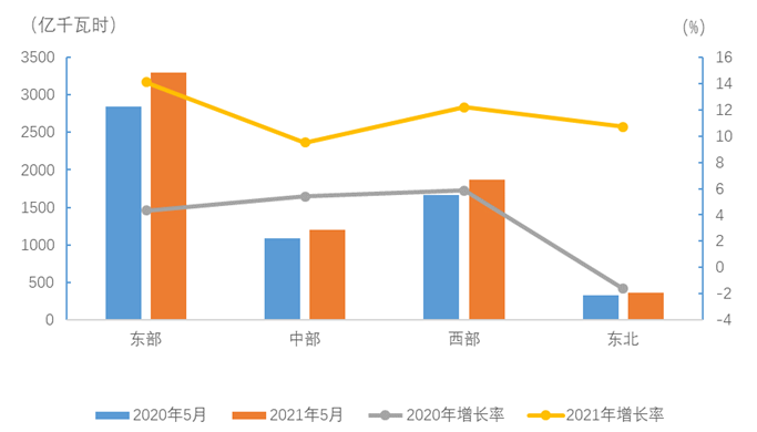 5月份,東、中、西部和東北地區全社會用電量增速分別為14.1%、9.5%、12.2%和10.7%。