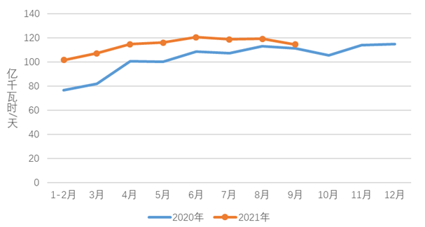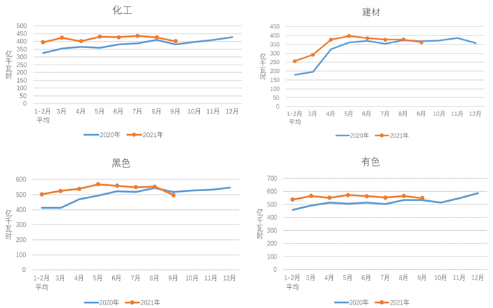1-9月,化工行業用電量3740億千瓦時,同比增長8.9%,增速比上年同期提高9.5個百分點;建材行業用電量3084億千瓦時,同比增長12.3%,增速比上年同期提高11.4個百分點;黑色金屬冶煉行業用電量4800億千瓦時,同比增長10.6%,增速比上年同期提高8.3個百分點;有色金屬冶煉行業用電量4996億千瓦時,同比增長7.3%,增速比上年同期提高3.9個百分點。