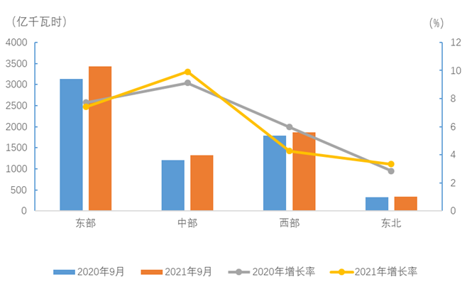 9月份,東、中、西部和東北地區全社會用電量增速分別為7.4%、9.9%、4.3%和3.3%。