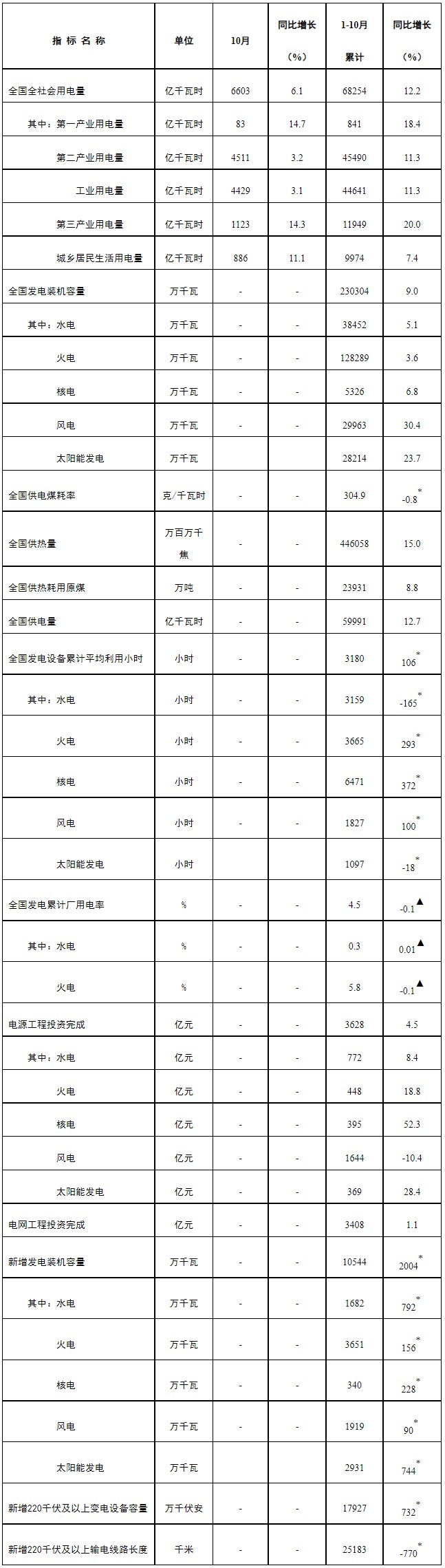 注:1.全社會用電量為全口徑數據,全國供電量為調度口徑數據。2.“同比增長”列中,標*的指標為絕對量;標▲的指標為百分點。