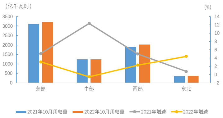 10月份,東、中、西部和東北地區全社會用電量增速分別為3.1%、-0.5%、2.3%和4.4%。