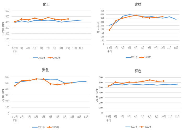 1-10月,化工行業用電量4523億千瓦時,同比增長5.3%;建材行業用電量3332億千瓦時,同比下降3.2%;黑色金屬冶煉行業用電量5087億千瓦時,同比下降4.9%;有色金屬冶煉行業用電量6182億千瓦時,同比增長2.9%。