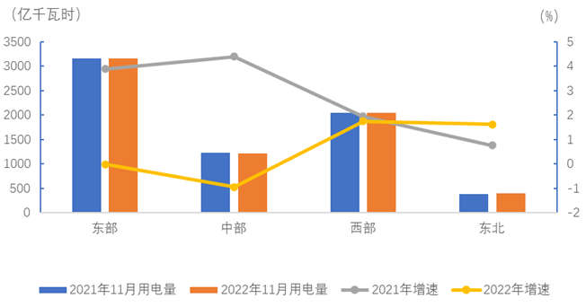 11月份,東、中、西部和東北地區全社會用電量增速分別為-0.02%、-0.9%、1.8%和1.6%。