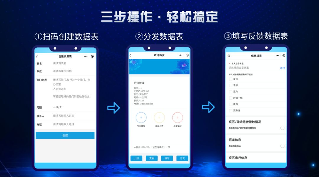 只需微信掃描二維碼進入界面,簡單進行三步操作即可搞定每日繁瑣的數據收集工作,并在系統后臺進行統計和數據匯總。使用說明書?不存在的!一秒上手,簡直So easy!