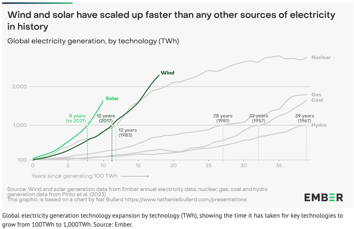 根據智庫Ember的最新報告分析,在全球范圍內風能和太陽能的增長速度比歷史上任何其他電力來源都快。太陽能和風能從每年100太瓦時增長到1000太瓦時,分別只花了8年和12年的時間。同樣是100太瓦時到1000太瓦時,天然氣電廠花了28年、煤電化了32年、水電花了39年。