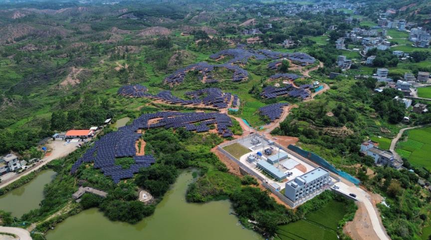 五華黃泥寨光伏項目是梅州市五華縣首個集中式大型光伏發電項目,總裝機容量70兆瓦,占地約1420畝,總投資約3.36億元。項目采用農光互補模式,利用光伏板下種植農作物及養殖雞、鴨等相結合,實現光伏發電與農業創收雙贏,拓寬農民增收渠道。該項目通過農光互補模式,不僅有效利用土地資源,還能對項目建設地的水土保持、防風固沙起到一定的保護作用。此外,通過植物腐爛后的再循環可以有效改善項目建設地的生態循環。