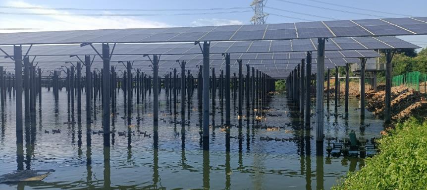 平坡光伏電站位于湛江市良垌鎮,總裝機容量90兆瓦,項目采用漁光互補模式,在1650畝水養殖魚塘上架設光伏組件,利用水面上的光伏組件發電,水下則可進行水產魚、鴨養殖。同時,經充分考慮白鷺等趨光性鳥類的生活特性,項目采用透光率極高的單晶雙玻雙面太陽能電池,其透光率達95%以上,因此,光伏陣列的反射光極少,很好地保障了鳥類生活環境不受破壞,實現了生態保護和能源綠色發展雙贏。