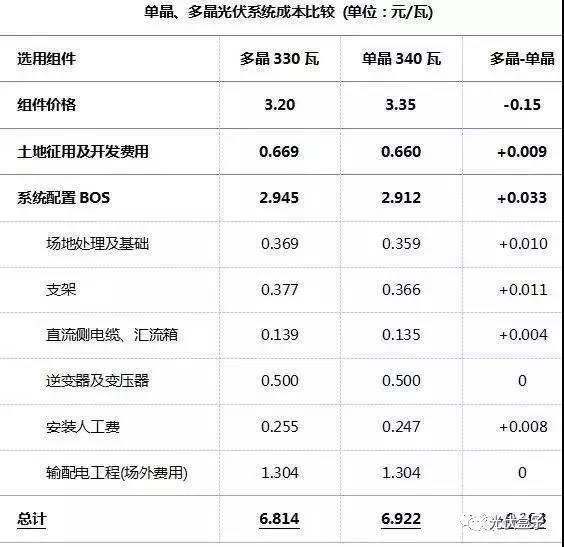 其中假設多晶組件價格為3.20元/瓦,單晶組件價格為3.35元/瓦。根據計算可知,多晶系統每瓦可以少花0.108元人民幣。