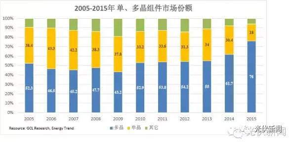 我們先來了解一些信息,圖一是05年到15年,單晶、多晶、薄膜等的市場份額變化,我們可以發現,從09年到15年,單晶、薄膜等的市場份額是不斷降低的,而多晶則在15年實現了一個井噴。圖二是日本單晶市場份額的統計數據,日本是一個國土面積十分有限的國家,對高效組件的需求應該超過其他國家,可是