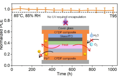 利用氟硅聚合物凝膠封裝的鈣鈦礦電池在高溫、高濕度(85℃、85%相對濕度)下運行1000小時,器件效率保持初始效率的98%,表現出了優異的濕熱穩定性。(西北工業大學材料學院納米能源中心供圖)