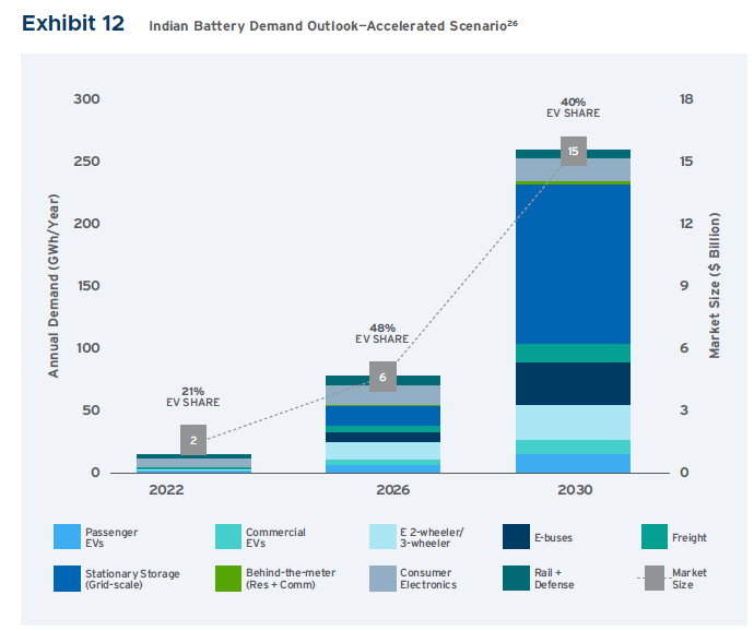 印度在先進電池技術制造方面的影響力如今微不足道。然而,該國擁有大規模電池制造的巨大潛力。報告指出,到2030年,印度的電池市場可能超過150億美元(約合1.12萬億盧比),到2030年,印度的電池需求預計將在“加速情景”中上升到260GWh。