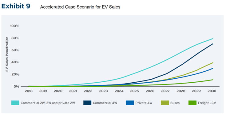 根據“加速情景”, 到2030年,電動汽車在新車銷售中的細分市場滲透率將達到私家車的30%、商用車的70%、公交車的40%以及兩輪和三輪車的80%。在“保守情景”中,預計2030年電動汽車在所有汽車細分市場的新銷量中的加權平均滲透率為35%。