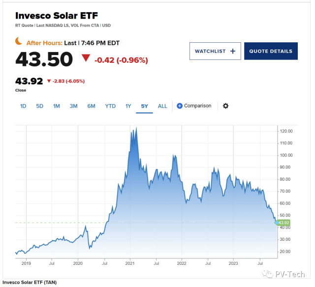 上周五(10月20日),Invesco Solar ETF(TAN)暴跌6.57%,最新交易價為44.18美元,創下2020年7月以來的最低水平。由于前景悲觀,太陽能行業股票普遍下跌。