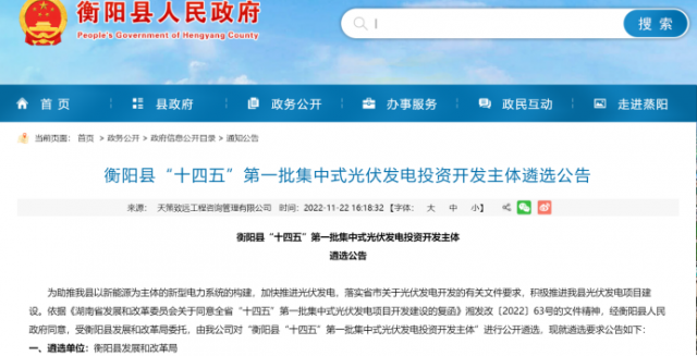 11月22日,湖南省衡陽縣“十四五”第一批集中式光伏發電投資開發主體遴選公告發布。