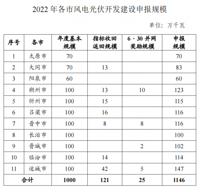 11月21日,山西省能源局發布了《2022年風電、光伏發電開發建設競爭性配置工作方案》(以下簡稱《方案》),明確指出,綜合考慮全省全社會用電量、外送電量、電網消納能力、可再生能源消納責任權重目標等因素,安排風電、光伏發電保障性并網年度規模1000萬千瓦,獎勵規模146萬千瓦。