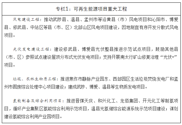加大風能開發力度。堅持風電發展與生態環境保護有機統一,堅守生態環保底線,統籌考慮全市風能資源、自然保護、電網消納等因素,積極推動風能開發利用。加快推進馬村區華潤、溫縣潔源等60萬千瓦存量風電項目建設,統籌謀劃武陟縣、溫縣、孟州市等縣(市)風力資源,打造沿黃百萬千瓦風電走廊,力爭到2025年全市風電并網容量累計達到120萬千瓦以上。