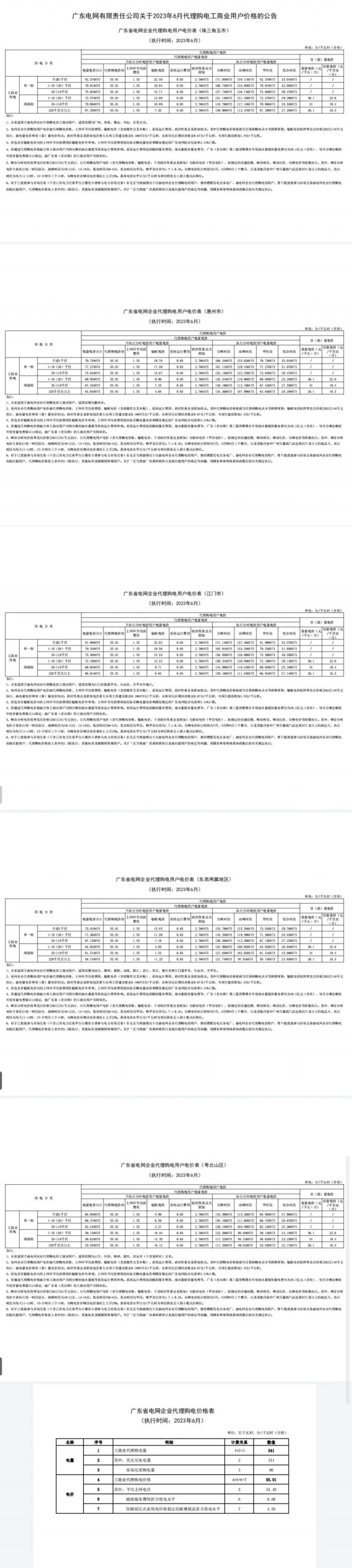 廣東全省各地區6月份代理購電價格均有小幅的下跌,近日發布《廣東省發展改革委轉發國家發展改革委關于第三監管周期省級電網輸配電價及有關事項的通知》(粵發改價格〔2023〕148號)。新的省級電網輸配電價自2023年6月1日起執行。即6月用電產生電費(7月發行電費)按新電價政策執行。