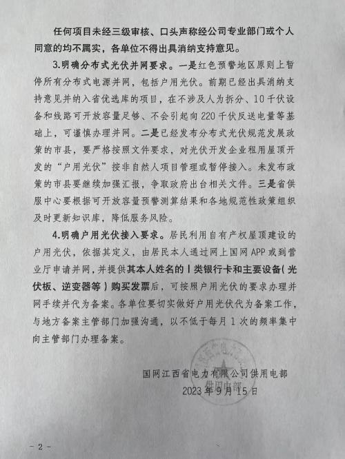 據網絡媒體消息:近日,國網江西省下發《關于進一步明確分布式光伏消納和并網服務有關事項的通知》,明確要求紅色預警地區暫停戶用光伏并網,對光伏開發企業租用屋頂開發的“戶用光伏”按非自然人項目管理或暫停接入,加強出具“消納意見”的管理,任何項目未經三級審核均不得出具消納意見。