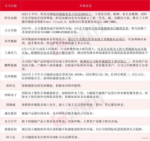 業內人士表示,隨著2023年美國光伏裝機重新恢復增長及ITC補貼力度的加大,預計美國儲能需求將恢復翻倍以上的增速。對此,不少儲能企業紛紛加速“出海”,以全面進軍海外市場為主要目標。據財聯社不完全整理,在海外有布局儲能相關業務的上市公司主要為陽光電源、天合光能、科華數據、上能電氣、鵬輝能源、億緯鋰能、欣旺達、科陸電子、固德威、盛弘股份、東方日升、派能科技、科士達等,具體情況如下:
