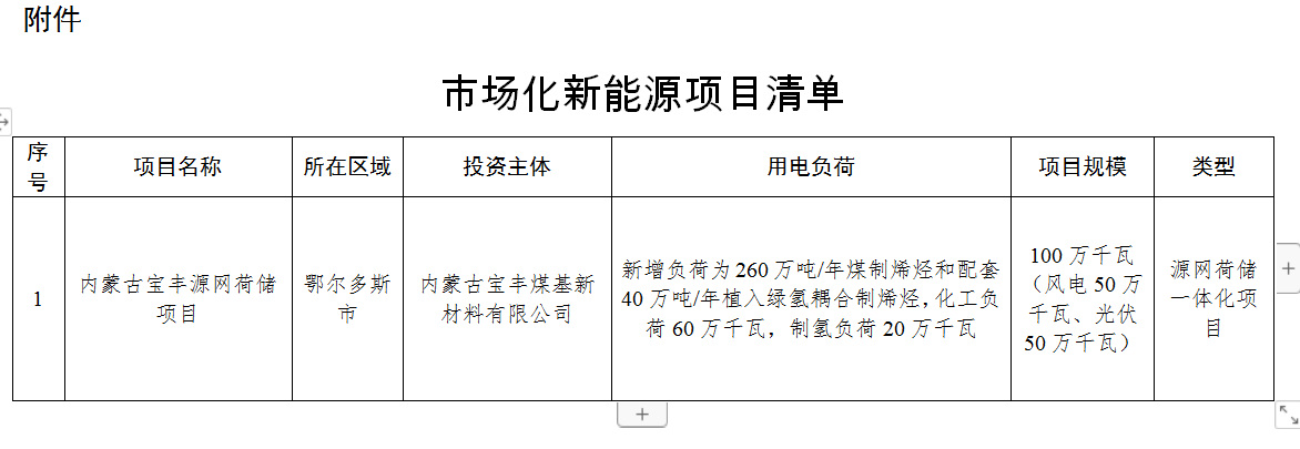 內蒙古寶豐源網荷儲一體化項目,新增負荷為260萬噸/年煤制烯烴和配套40萬噸/年植入綠氫耦合制烯烴,化工負荷60萬千瓦,制氫負荷20萬千瓦,新能源建設規模為100萬千瓦(其中,風電50萬千瓦、光伏50萬千瓦),儲能規模為20萬千瓦/60萬千瓦時。