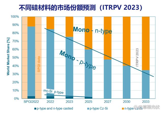 于是在包括晶澳在內的頭部企業紛紛布局之下,n型產能迎來了迅速提升。據PV InfoLink預估,2023年底TOPCon名義產能將有望超過600GW,組件出貨有望達到約120GW上下的水平。明年上半年預計將有400GW-500GW產能投向市場。中期看,ITRPV預測,到2033年n型產能市場占比有望達到60%,成為市場主流技術。