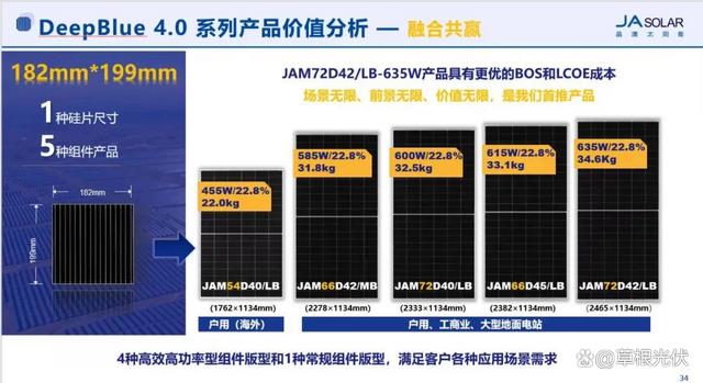 據晶澳產品技術總監張軍介紹,n型72新版型(JAM72D42-635)與原先182-n-78版型尺寸相同,功率可高達635W,組件效率22.8%,是目前行業182系列產品中功率最高的產品。另外,較原78版型產品Voc降低7.6%,熱斑可靠性更優;系統端單串組件數量增加,BOS成本更低。