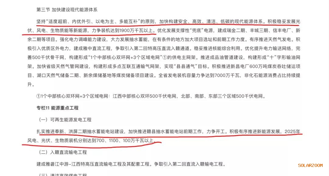 文件顯示,江西省將在“十四五”期間堅持“適度超前、內優外引、以電為主、多能互補”的原則,加快構建安全、高效、清潔、低碳的現代能源體系。積極穩妥發展光伏、風電、生物質能等新能源,到2025年力爭裝機達到1900萬千瓦以上。其中,風電、光伏、生物質裝機分別達到700、1100、100萬千瓦以上。