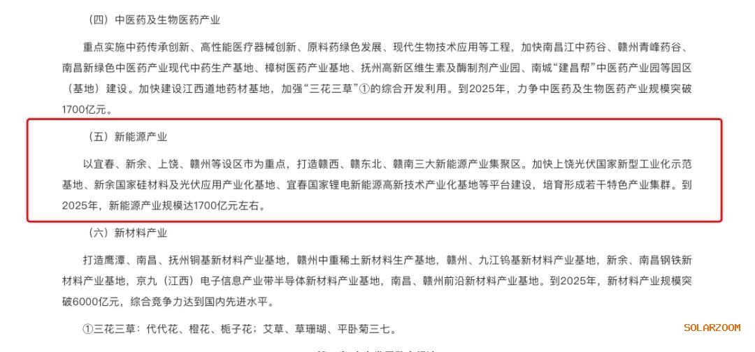 以宜春、新余、上饒、贛州等設區市為重點,打造贛西、贛東北、贛南三大新能源產業集聚區。加快上饒光伏國家新型工業化示范基地、新余國家硅材料及光伏應用產業化基地、宜春國家鋰電新能源高新技術產業化基地等平臺建設,培育形成若干特色產業集群。到2025年,新能源產業規模達1700億元左右。