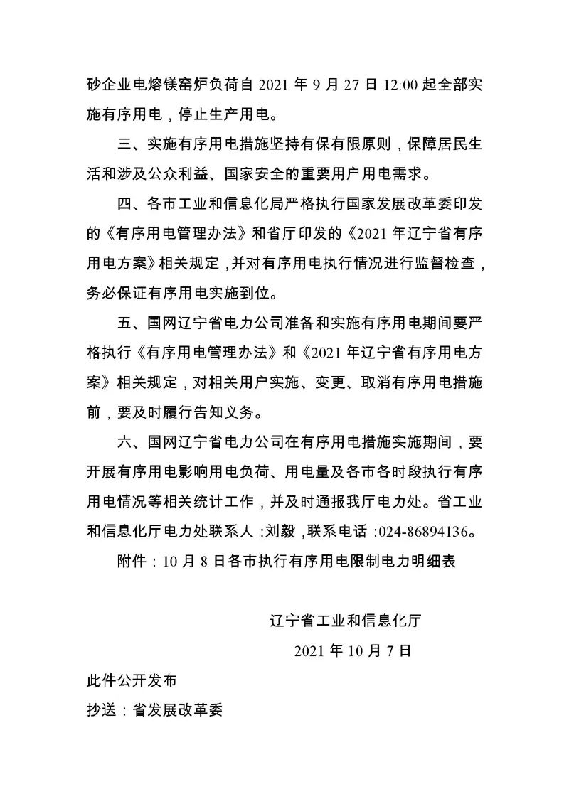 根據(jù)電力供需平衡預(yù)測,10月8日遼寧省最大電力缺口為462萬千瓦,依據(jù)國家發(fā)改委《有序用電管理辦法》,為嚴重缺電II級橙色預(yù)警。決定10月8日0:00-5:00限制電力97萬千瓦,5:00-8:00限制電力395萬千瓦,8:00-11:00限制電力275萬千瓦,11:00-15:00限制電力210萬千瓦,15:00-21:00限制電力462萬千瓦,21:00-22:00限制電力222萬千瓦,22:00-24:00限制電力274萬千瓦。