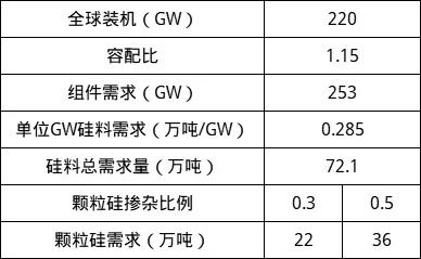顆粒硅行業(yè)總市場(chǎng):以2022年全球光伏裝機(jī)量220GW+1.15倍容配比+每GW組件需硅料0.285萬(wàn)噸+顆粒硅摻雜比例占30%測(cè)算,顆粒硅潛在總市場(chǎng)規(guī)模約22萬(wàn)噸。同時(shí)隨著未來(lái)顆粒硅生產(chǎn)技術(shù)和使用方法的進(jìn)步,可以預(yù)期顆粒硅未來(lái)?yè)诫s比例將有望提高到50%,若2022年達(dá)到則顆粒硅行業(yè)潛在總市場(chǎng)有望達(dá)到36萬(wàn)噸。