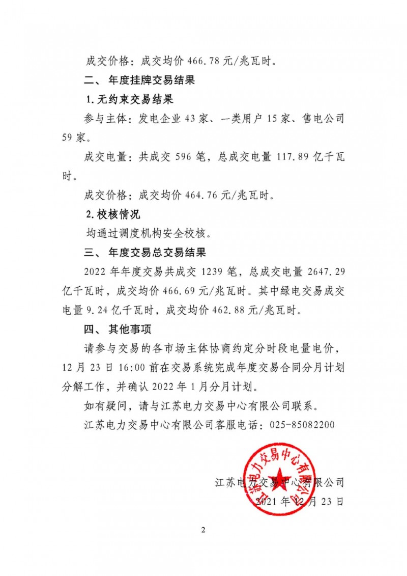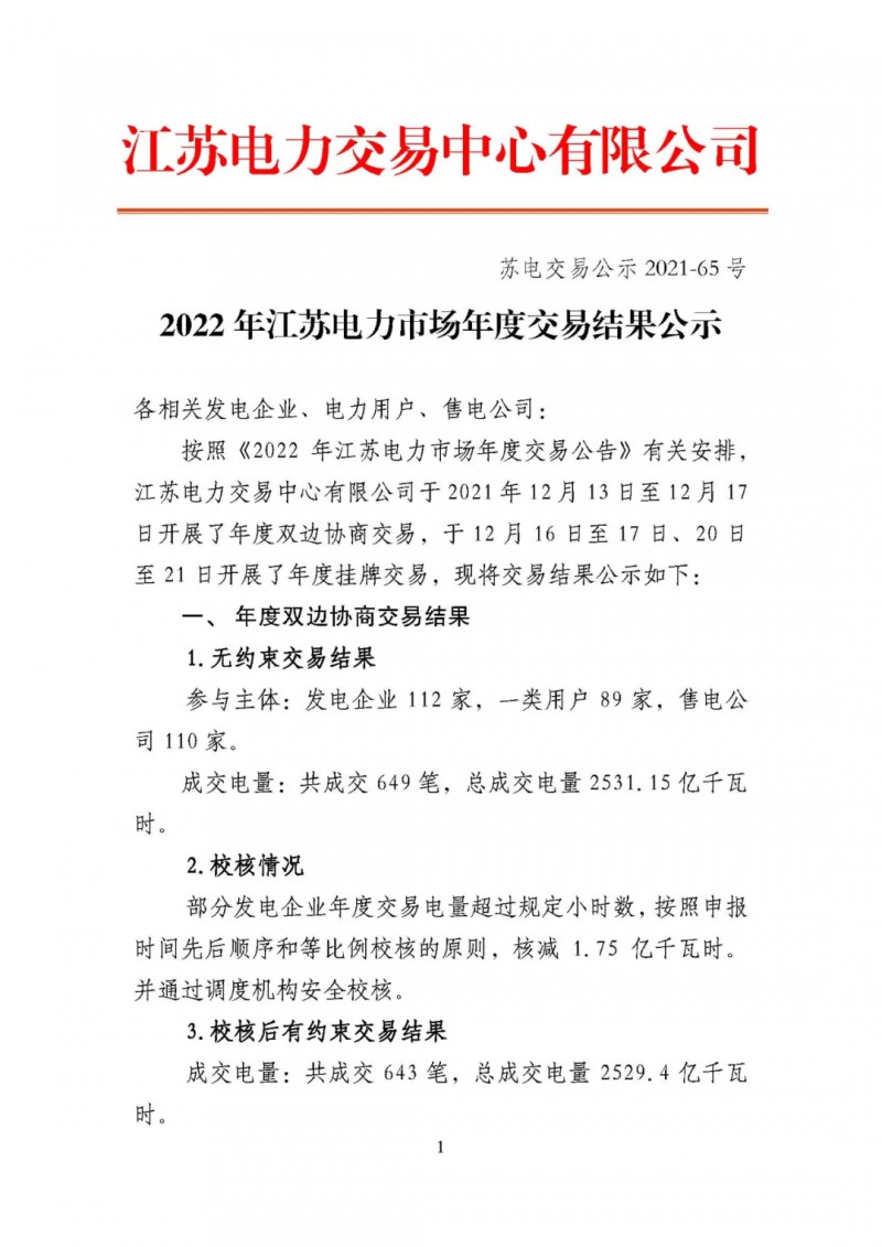 12月23日,江蘇電力交易中心有限公司發布了2022年江蘇電力市場年度交易結果。江蘇電力交易中心有限公司于2021年12月13日至12月17日開展了年度雙邊協商交易,于12月16日至17日、20日至21日開展了年度掛牌交易。