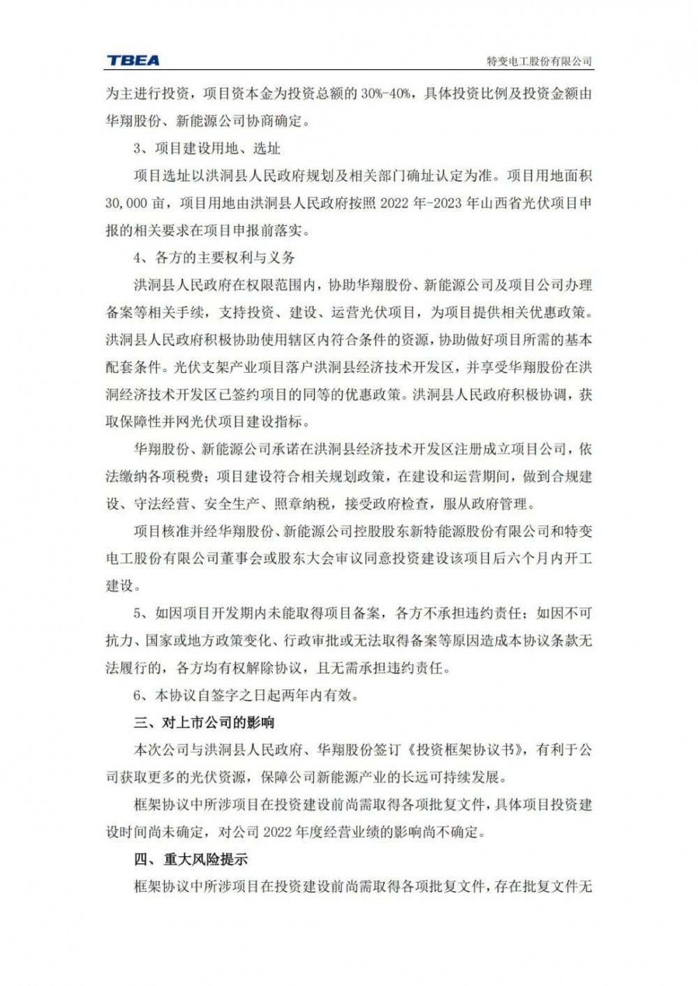 特變電工新疆新能源股份有限公司與洪洞縣人民政府、華翔股份在山西省臨汾市洪洞縣簽署了《1GW 光伏發電及配套項目投資框架協議書》。