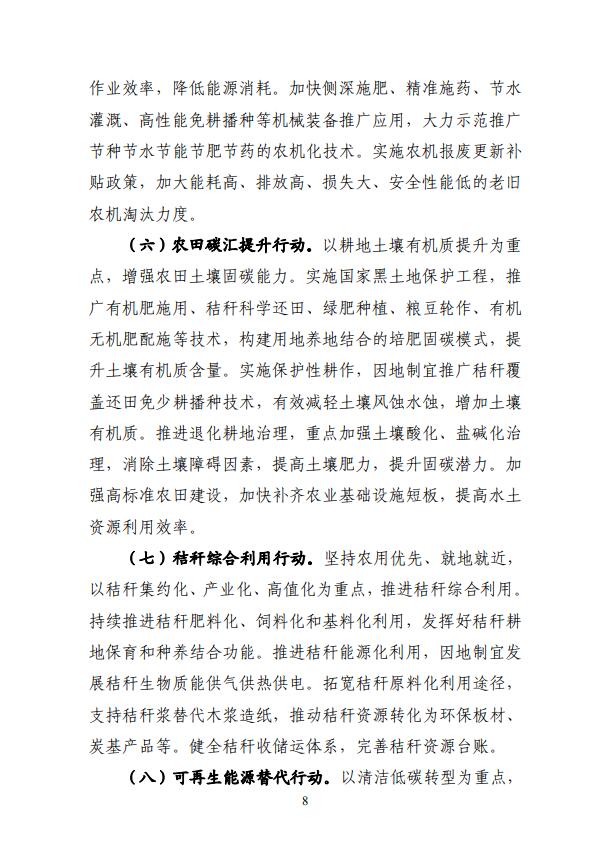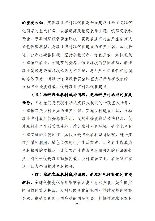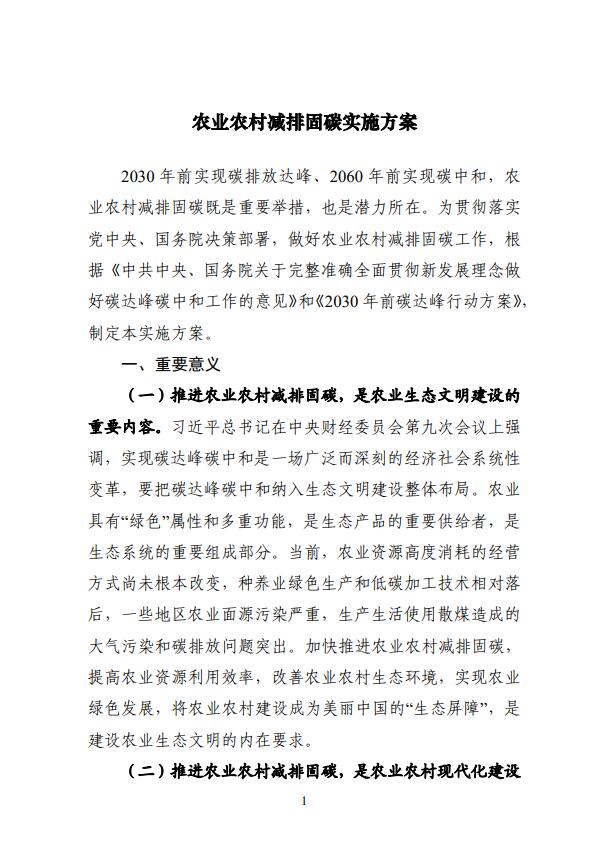 為貫徹落實碳達峰碳中和重大決策部署,推進農業農村綠色低碳發展,我們制定了《農業農村減排固碳實施方案》,現印發你們,請結合實際貫徹落實。
