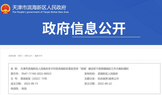 濱海新區落實支持“濱城”建設若干政策措施的工作方案的通知