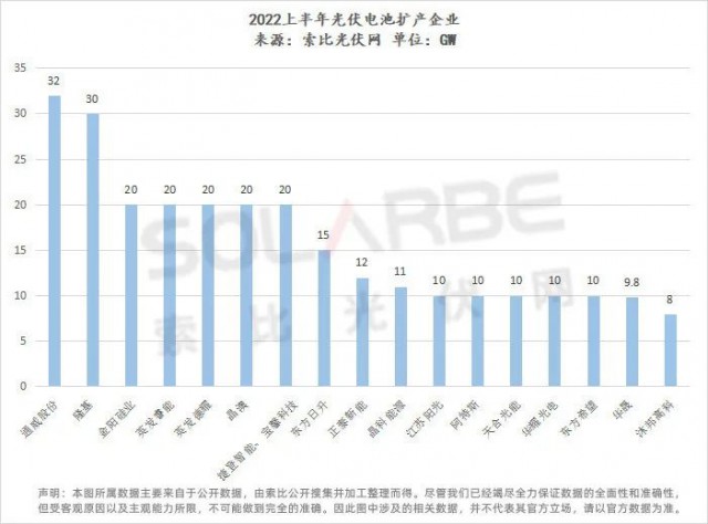 今年上半年,光伏電池擴產(chǎn)規(guī)模超292.5GW,投資總額超932億元。其中,170GW已經(jīng)明確落地時間:2022年預計投產(chǎn)30.3GW、2023年106.41GW、另有35GW預計在2024-2025年投產(chǎn)。