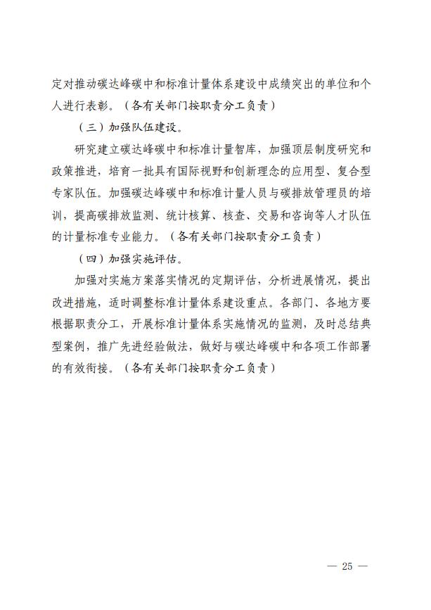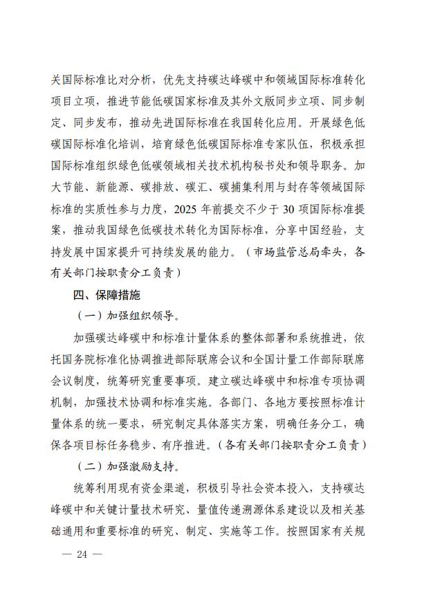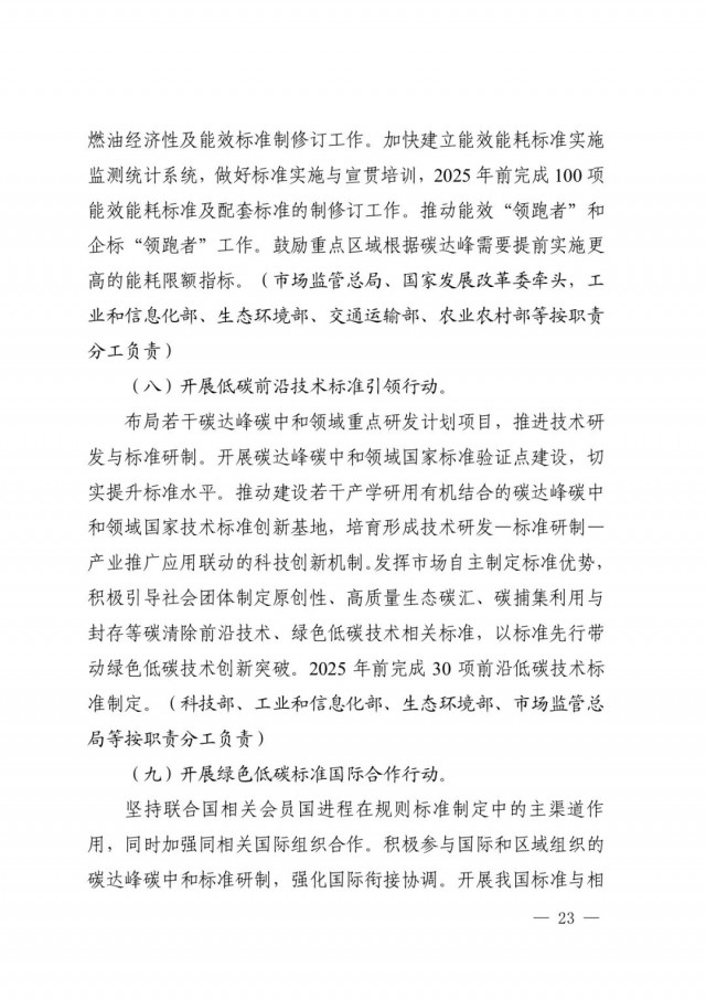 作為碳達峰碳中和“1+N”政策體系中重要文件之一,提出了完善碳排放基礎通用標準體系、加強重點領域碳減排標準體系建設、加快布局碳清除標準體系、健全市場化機制標準體系、完善計量技術體系、加強計量管理體系建設、健全計量服務體系7個方面的24項重點任務,明確了實施碳計量科技創新工程、碳計量基礎能力提升工程、碳計量標桿引領工程、碳計量精準服務工程、碳計量國際交流合作工程5項重點工程,開展雙碳標準強基行動、百項節能降碳標準提升行動、低碳前沿技術標準引領行動、綠色低碳標準國際合作行動4項重點行動,并對協調推動各項工作落實提出相應要求。