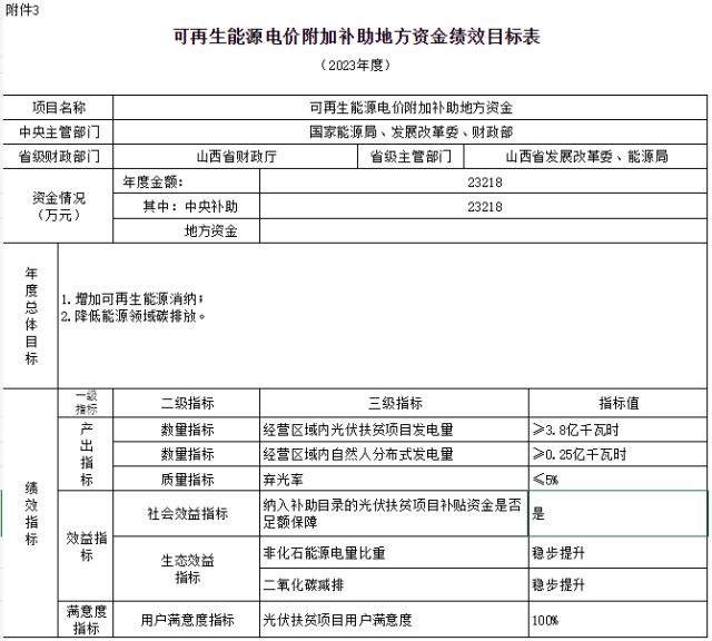 四、為保障資金安全,提高資金使用效率,電網(wǎng)企業(yè)應(yīng)按年度對補貼資金申請使用等情況進行全面核查,必要時可聘請獨立第三方。為深入貫徹落實《中共中央 國務(wù)院關(guān)于全面實施預(yù)算績效管理的意見》,切實提高財政資金使用效益,請你單位在組織預(yù)算執(zhí)行中對照績效目標(附件3)做好績效監(jiān)控,確保年度績效目標如期實現(xiàn)。同時,你單位應(yīng)按規(guī)定及時上報績效自評結(jié)果,績效自評結(jié)果將作為分配預(yù)算資金的重要依據(jù)。