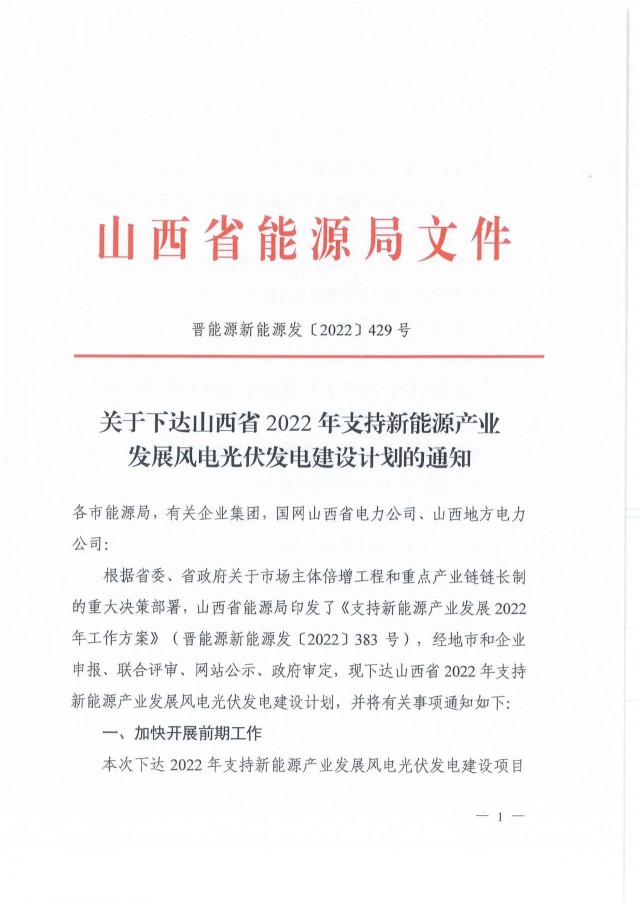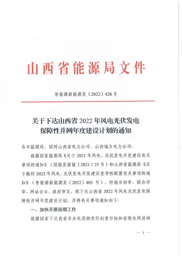 近日,山西省能源局先后印發(fā)了《關(guān)于下達(dá)山西省2022年風(fēng)電光伏發(fā)電保障性并網(wǎng)年度建設(shè)計(jì)劃的通知》(晉能源新能源發(fā)〔2022〕428號(hào))和《關(guān)于下達(dá)山西省2022年支持新能源產(chǎn)業(yè)發(fā)展風(fēng)電光伏發(fā)電建設(shè)計(jì)劃的通知》(晉能源新能源發(fā)〔2022〕429號(hào)),共下達(dá)風(fēng)電、光伏項(xiàng)目132個(gè),規(guī)模合計(jì)1418萬(wàn)千瓦(14.18GW)。