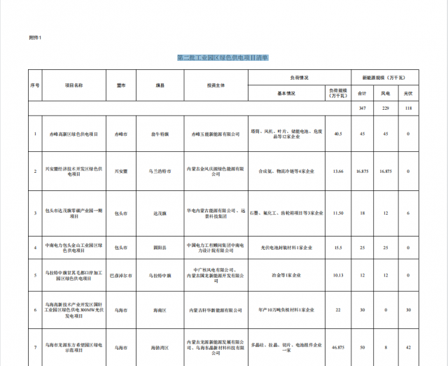 按照《內蒙古自治區工業園區綠色供電項目實施細則(2022年版)》要求,我局組織專家對各盟市申報的第二批工業園區綠色供電項目方案進行了評估,全區有13個項目納入自治區第二批工業園區綠色供電項目清單,共配建新能源規模347萬千瓦,其中風電229萬千瓦、光伏118萬千瓦。經報請自治區人民政府同意,現將第二批工業園區綠色供電項目清單(附件一)印發你們,并將有關要求通知如下。