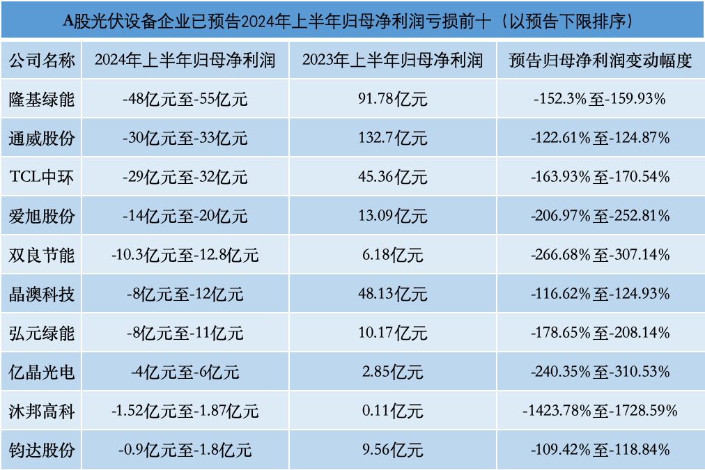 iFinD數據顯示,截至7月16日,在申銀萬國光伏設備行業分類的64家上市公司中,已有22家預披露了2024年上半年業績。其中,9家企業實現盈利,占比不足五成;18家企業歸母凈利潤同比下滑,占比超過八成。值得注意的是,在虧損前十的榜單中,包括通威股份、隆基綠能、TCL中環等在內的頭部企業占據多數。
